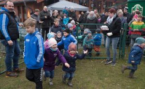 Halb sieben stieg die Spannung vor dem Zaun zum Kindergarten Bollerwagen, der wieder seinen Spielpark zur Ostereiersuche zur Verfügung gestellt hatte. Die Kleinsten hamsterten sich die Hände und Taschen voll.